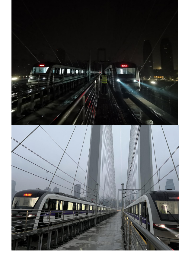 南纪门轨道专用桥全长1215.878米,主跨480米,是10号线二期工程的重要跨江通道,也是该线的关键控制性工程。本次桥梁荷载试验分为静载试验和动载试验两部分。其中静载试验是指车辆停放在桥梁上,检测桥梁主塔、主梁、斜拉索等关键结构的实际内力和变形,由此判断桥梁结构在静力荷载下的工作状态。而动载试验则是让列车开起来,判断桥梁在车辆运动时的状态。通过这两种试验对桥梁进行一个拥有检查,判断各部位质量限行是否满足设计要求,从而保证列车的通行安全。